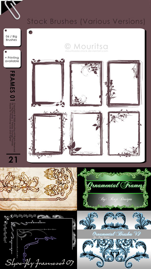 Набор состоит из таких комплектов, как: кривые линии, абстрактные взрывы и цветочные формы. Разрешение каждой кисти имеет диапозон до 2500 px.