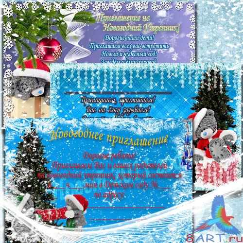 Набор приглашений в свежий год начиная с мишками тедди 3 оригинальных шаблона с целью приглашения детей в новогоднюю ёлку, новогодний утренник. Формат: PSD | Разрешение: 1772x1181, 300 dpi | Слои отключены | величина архива: 12,43 Mb Автор: qwerty2009
