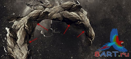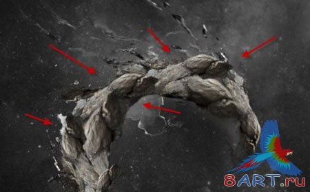 Добавляем реализма в виде осколков камней, летящих от буквы. Со все той же текстуры камня с помощью быстрого выделения (Quick Selection Tool, клавиатурное сокращение - W) выделяем и копируем произвольные кусочки камней, попутно можем их трансформировать и поворачивать.