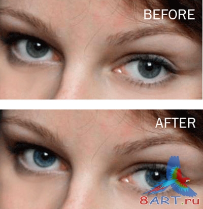Поработаем с глазами. Сначала белки. Создаем новый слой, задаем ему режим смешивания Перекрытие (Overlay) и основной цвет белый. Из палитры инструментов берем мягкую кисть с диаметром 8px и закрашиваем белки глаз, после чего непрозрачность слоя установим 20 - 35%.