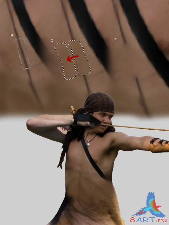 С помощью данного шага можно удалять ненужные детали. В данном случае – полоску на груди стрелка. Для этой цели возьмем инструмент Заплатка (Patch Tool). Выделите маленький участок полоски и просто перенесите его на ближайший участок, где полоски нет. Уберите выделение. Так же нужно поступить со всеми оставшимися частями ненужной детали.