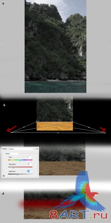 Для создания фона возьмем изображения с горой и землёй. Сначала необходимо их открыть в программе Фотошоп. Затем, открыв картинку с землёй, возьмите инструмент Свободная трансформация (Ctrl+T). Используйте вид трансформации Искажение и переместите угловые маркеры в соответствии с рисунком ниже. После этого подстройте для картинки с землей Цветовой тон/Насыщенность. Мягкой Кистью среднего размера, чёрного цвета прорисуйте там, где показано в части d следующего рисунка.