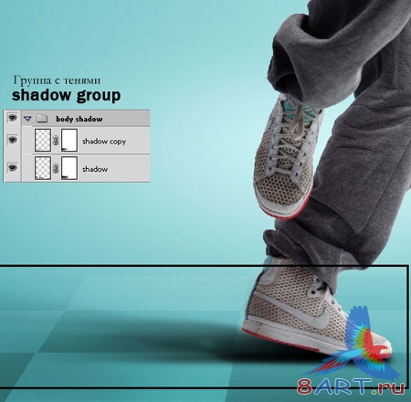 Теперь настала очередь «заняться» тенью от кроссовка. Снова нажимаем и удерживаем клавишу CTRL, кликаем по миниатюре танцовщицы (загружаем новое выделение). Делаем новый слой и называем его Shoe Shadow (Тень от ботинка). Выбираем далее кисть (Brush), цвет черный, непрозрачность (Opacity) – 20%. Обводим нижнюю часть кроссовка девушки (смотри рисунок ниже).