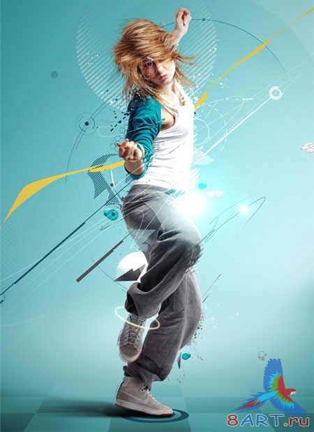 С помощью программы Фотошоп можно создавать очень красивые произведения, например, танцовщицу, которая танцует брейк-данс.