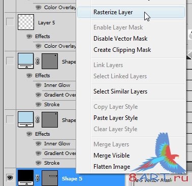 Для создания тени одним нажатием правой кнопкой мыши на данном слое, находящемся в палитре слоев выбираем функцию Растрировать слой (Rasterize Layer).