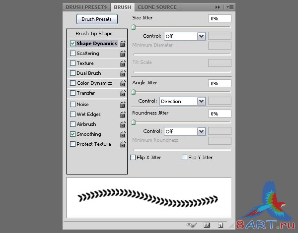Отметьте Shape Dynamics как показано ниже , и удостоверьтесь, что выбрали направление из выпадающего меню Контроля под Угловым счетом Колебания. Это важно, поскольку это заставит стежки следовать за направлением текста вместо того, чтобы иметь тот же самый угол.