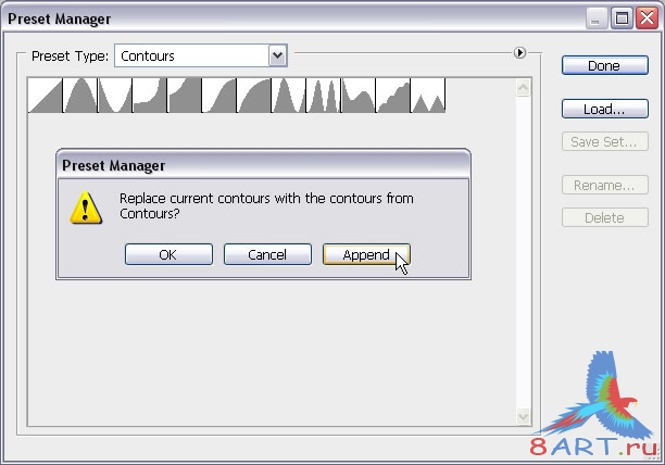 Прежде, чем применить Layer Styles, необходимо Загрузить Contours. Выберите Редактирование - Заданный менеджер (Edit > Preset Manager ), и выбрать Контуры (Contours )из выпадающего меню.
