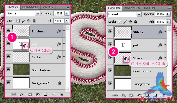 Дважды щелкните на слой Stitches, чтобы применить следующие Стили Слоя: