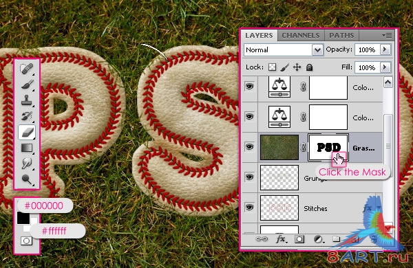 Установите основной цвет # 000000 и фоновый цвет # FFFFFF, возьмите Eraser Tool, нажмите на копию "Текстура травы" Layer Mask.