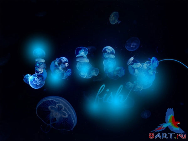 Под медузами напишем слово «Fish». Настройки для шрифта можно увидеть на скриншоте снизу. Цвет выберем #75abff.