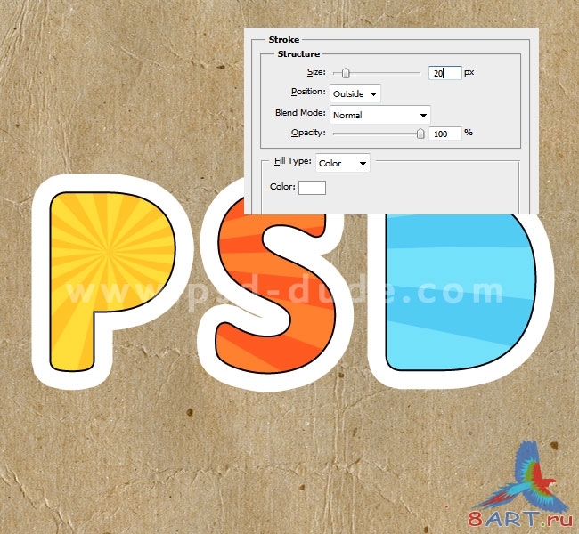 При работе с цветными буквами добавим векторных лучей (ссылка вверху). Для узора надо создать обтравочную маску. Настроим стиль, для каждой буквы алгоритм действий один и тот же. В правой панели слоев, двойным кликом по слою нужной буквы, открываем окно настроек стиля. Выбираем стиль Обводка (Stroke), в настройках выставляем толщину обводки 2 рх, а цвет выбираем черный. После того, как Вы «обработаете» все буквы, каждый слой-букву необходимо преобразовать в смарт-объект и снова для каждой применить стиль Обводка (Stroke), но с другими настройками: толщина 20 рх, цвет – белый.