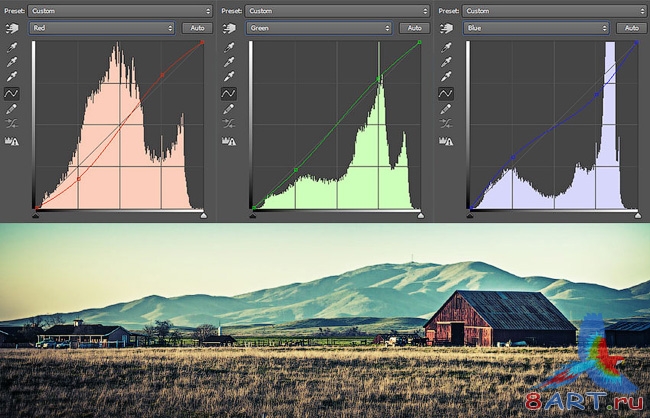 4) В настройках канала корректирующего слоя Кривые (Curves), выберите красный (red) канал, чтобы создать более резкую "s" кривую.