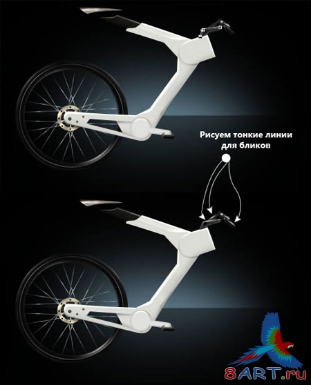 Теперь приступаем к созданию мелких деталей велосипеда и его отражений. Просмотрите внимательно рисунок ниже и сделайте все так как там указано.