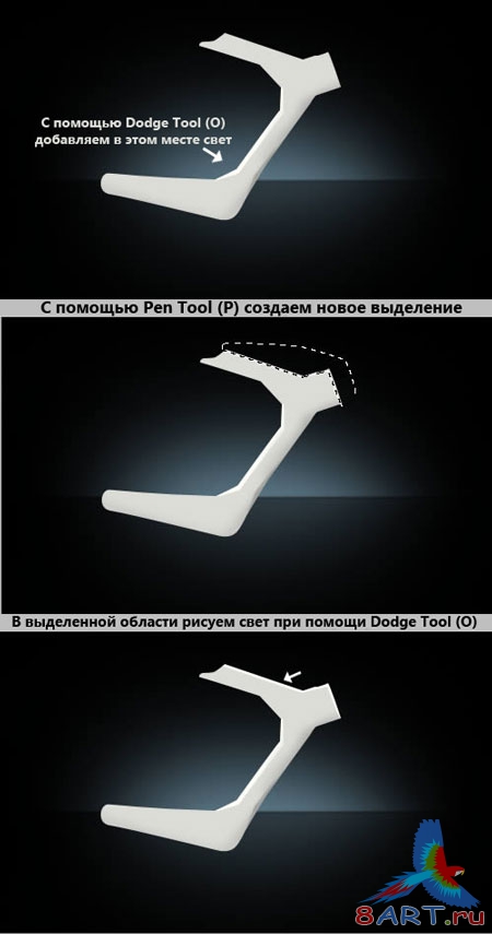 Теперь мы будем придавать объемности основе велосипеда при помощи инструментов выделения, осветления и затемнения. Чтобы добавить тени и световую область необходимо выделить нужную часть инструментом выделения и применяя Затемнитель (Burn Tool) для теней, нажав (О). Потом применяем осветитель (Dodge Tool) также нажимая (О), но уже для бликов. Этот этап состоит только из добавления бликов.