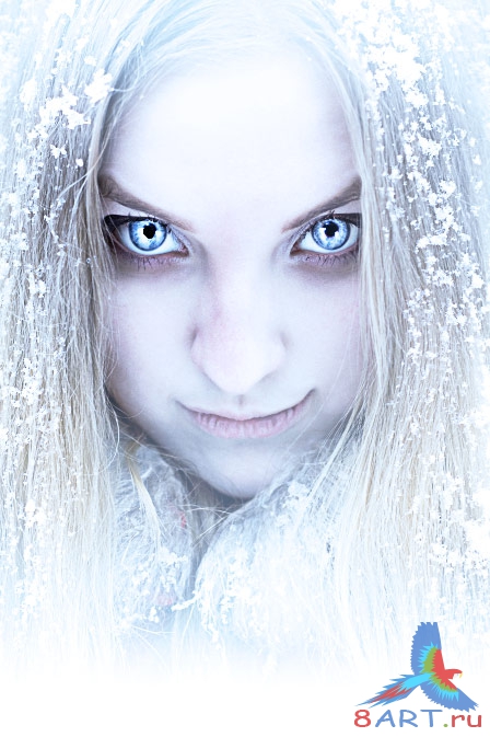 А сейчас нужно сделать ее лицо более выразительным, чтобы остальные детали отошли на второй план. Для этого мы сделаем глаза немного светлее, чтобы они не очень были похожи на человеческие (используем осветлитель Dodge tool). А тени сделаем вокруг глаз и лица (используем затемнитель Burn tool).