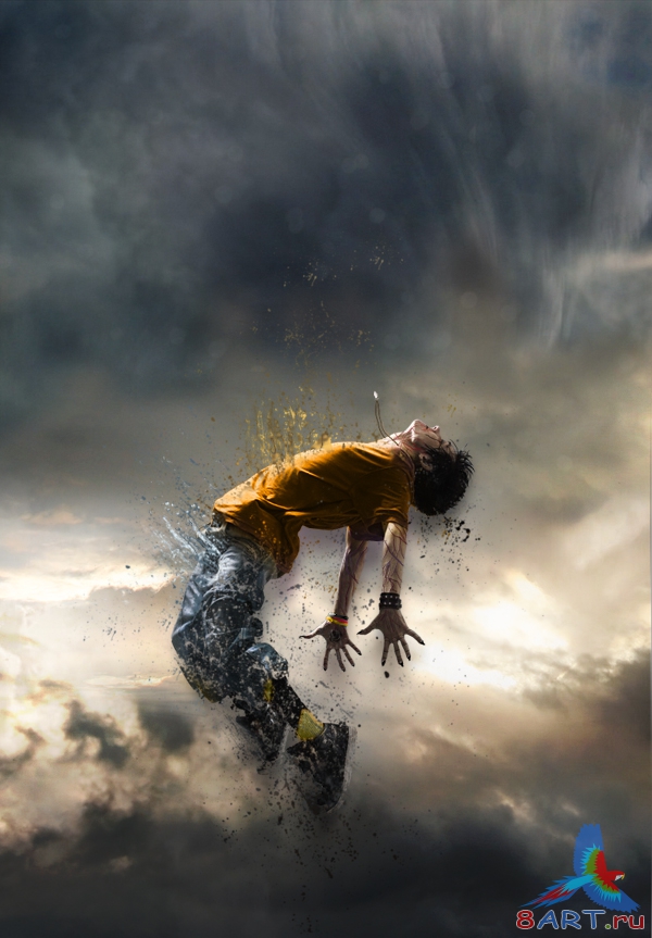 Выбираем инструмент Ластик (Eraser Tool), а затем добавте кисти "брызги" и переходите к палитре кистей (F5)/ Вам необходимо настроить ластик в виде брызг, как оказано на рисунке 4. Данным ластиком Вам необходимо стиреть ноги танцора как на картинке.