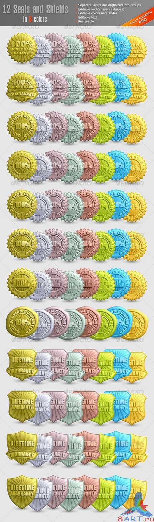 Embossed Seals and Shields - GraphicRiver Set includes 8 seals and 4 shields in 8 colors. - Separate layers are organized into groups. - Editable vector layers (shapes). - Editable colors and styles. - Editable Smart Objects. - Editable text. PSD | 19.4