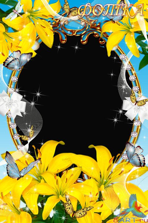 Цветочная рамка на фотошоп - Жёлтые лилии также бабочки