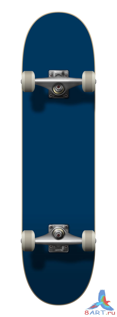 Голубой новенький скейтборд. Демонстрирует в вертикальном положении, как прикреплены колеса к доске. Вроде надежно. Обновим?