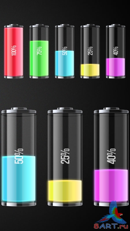 5 батареек с прозрачными стенками. Внутри жидкость разных цветов. Количество жидкости соответствует проценту оставшегося ресурса мощности.