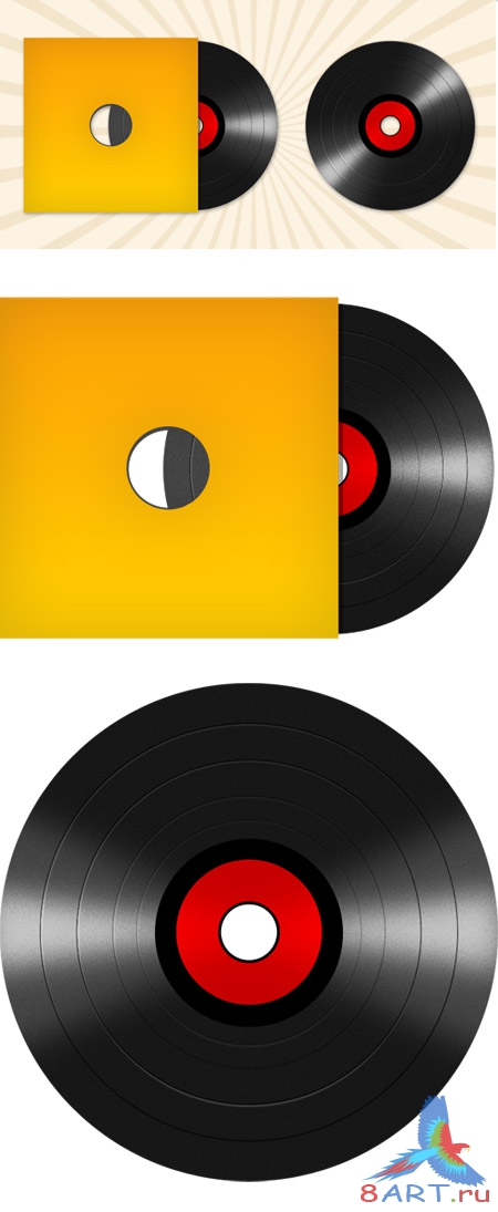 Виниловый диск наполовину выдвинули из желтого конверта, затем достали, затем эти два изображения увеличили.