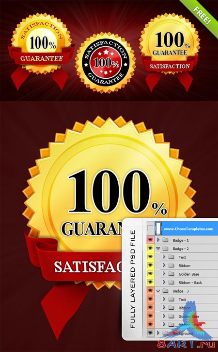 Круглая наклейка 100% гарантии качества. Золотой цвет, красная ленточка и цифра «100» стараются убедить: «мы – люкс!». Сомнений быть не может.