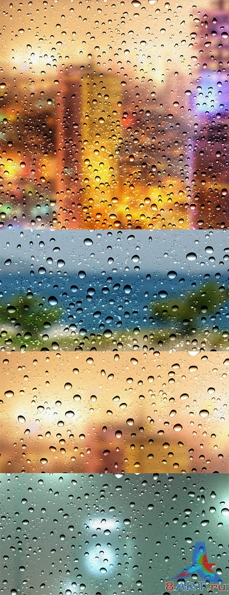 Запотевшее стекло с каплями воды, за которым едва различимы разные разноцветные пейзажи.