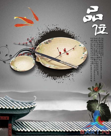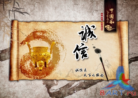 Дерзкий и стильный плакат для вашей рекламы. В исходнике представлен завернутый папирус с китайскими иероглифами.