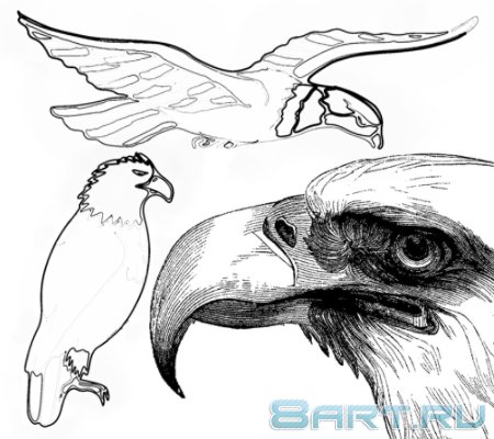 В наборе содержится шестнадцать кистей с изображением орлов. Кистей достаточно много, и самое главное они большого размера, тем не менее, качество некоторых оставляет желать лучшего. Средний размер кистей составляет 1200 пикселей.