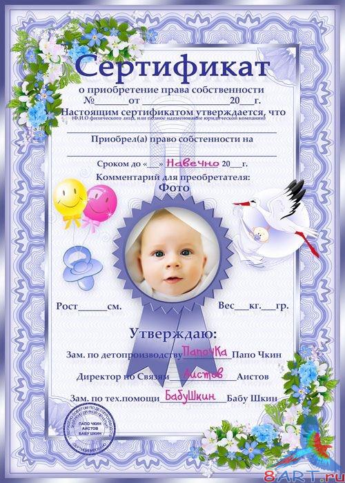 Многослойный официальный смешной Сертификат для доход права в новорожденного Psd - однако слои повизитно | 2480 x 3508 | 300 dpi | 206 MB Автор: Tramplin