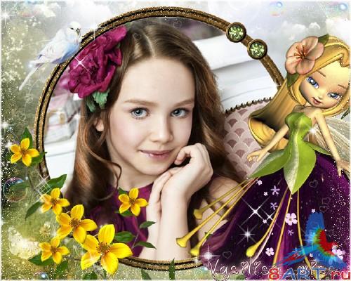 Красивая детская рамочка с целью фотошопа в фоне сказочного пейзажа от красивой феей